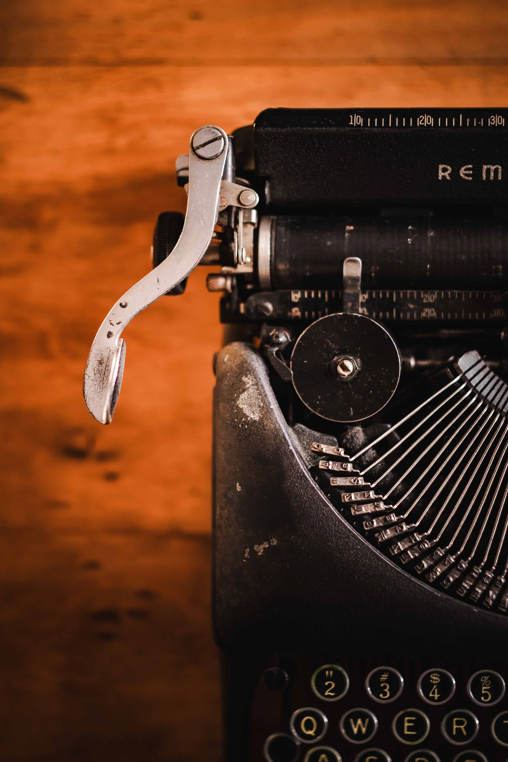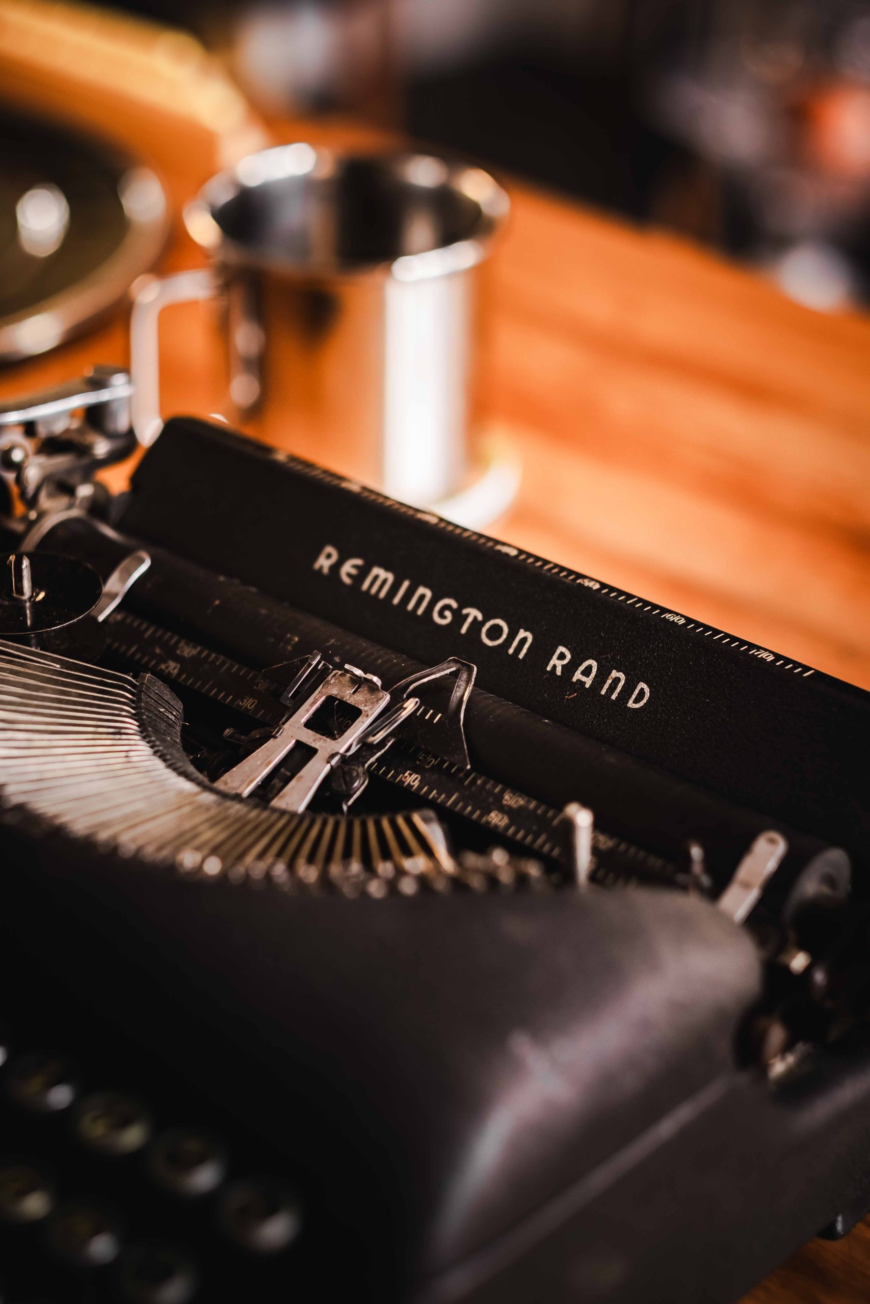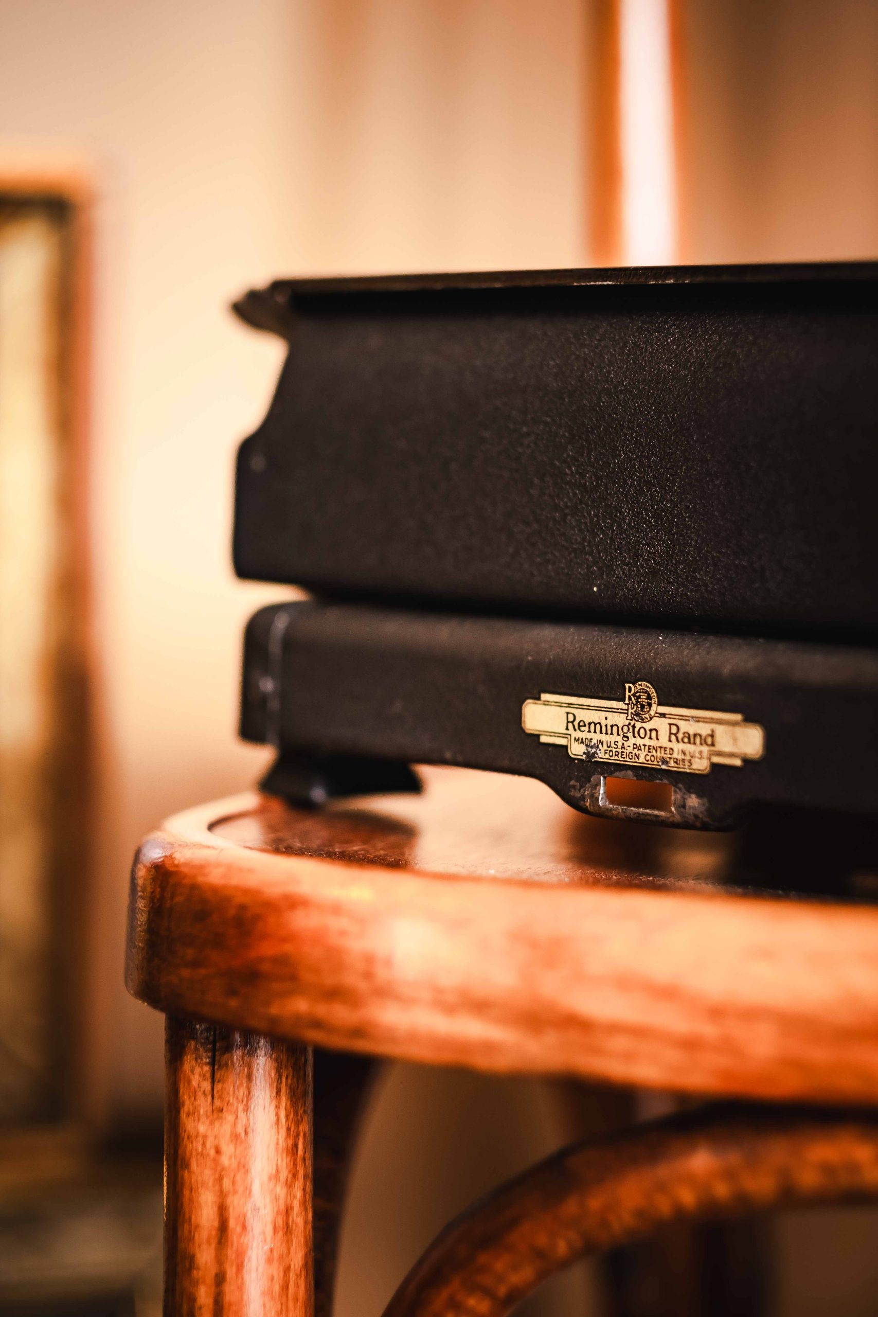 A beautifully preserved Remington Rand portable typewriter (it comes with its box) dating from around 1947, an iconic American design from the post-war period. This piece embodies the understated elegance of mid-century office objects.